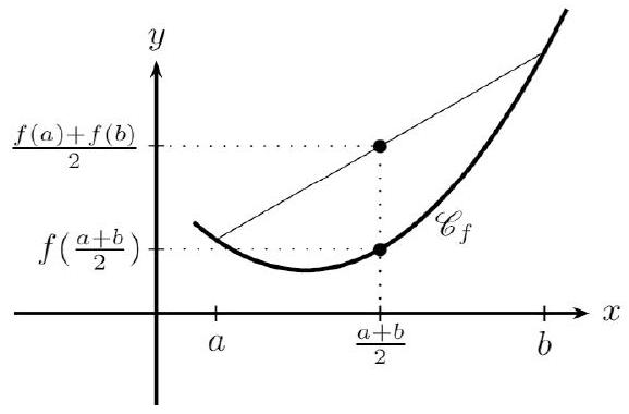 $f$ est convexe sur I si et seulement si, pour tous $a$ et $b$ de I, $f\left(\frac{a+b}{2}\right) \leq \frac{f(a)+f(b)}{2}$.