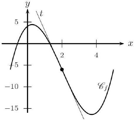 Le point A est un point d'inflexion de la courbe $\mathrm{C}{f}$ lorsque la courbe $\mathrm{C}{f}$ y traverse sa tangente $t$.