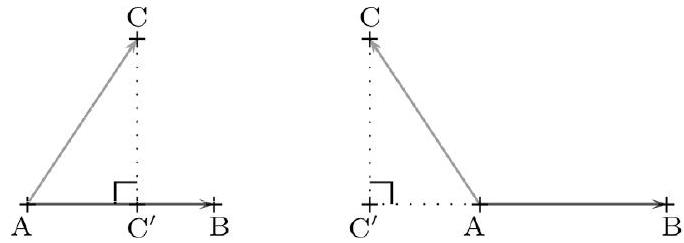 Si A et B sont deux points distincts, Si C'' est le projeté orthogonal de C sur (AB), alors : $\overrightarrow{A B} \cdot \overrightarrow{A C}=A B \times A C^{\prime} \quad$ si $\overrightarrow{A B}$ et $\overrightarrow{A C^{\prime}}$ ont même sens. $\overrightarrow{A B} \cdot \overrightarrow{A C}=-A B \times A C^{\prime} \quad$ si $\overrightarrow{A B}$ et $\overrightarrow{A C^{\prime}}$ sont de sens opposés. $\overrightarrow{A B} \cdot \overrightarrow{A C}=0 \quad$ si $\overrightarrow{A C^{\prime}}=\overrightarrow{0}$.