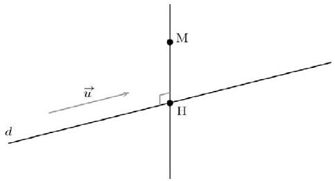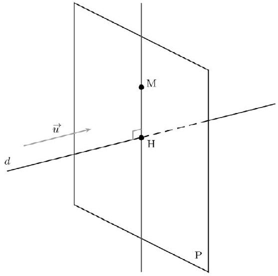 Soit M un point de l'espace. Soit $d$ une droite de vecteur directeur $\vec{u}$. Le projeté orthogonal du point M sur la droite $d$ est le point H si et seulement si H appartient à $d$ et au plan P passant par M et de vecteur normal $\vec{u}$.