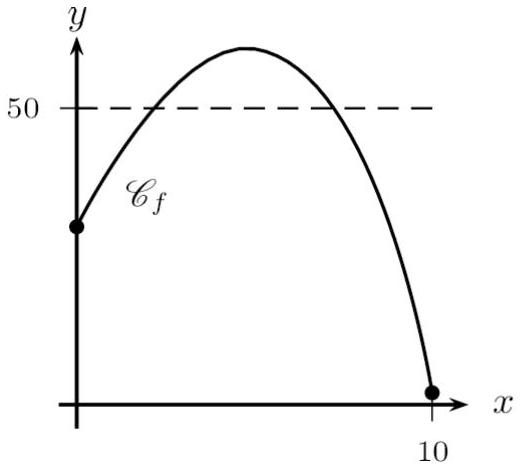 Figure 3 ci-après : L'équation $f(x)=50$ admet deux solutions sur [ $0 ; 10$ ].