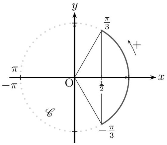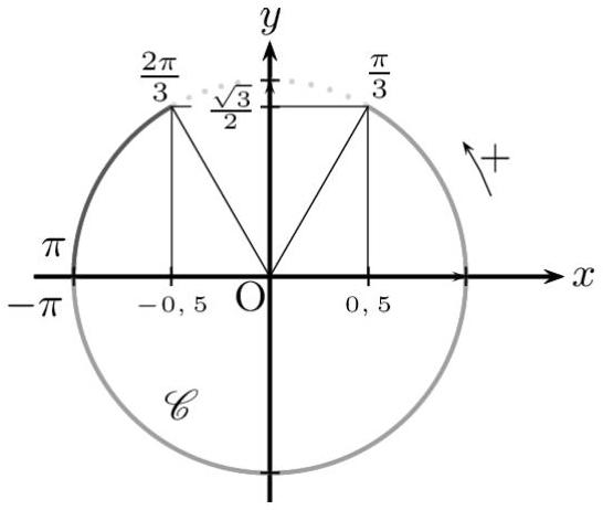 Et comme on raisonne sur ] $-\pi ; \pi]$, on obtient : $\quad x=\frac{\pi}{3} \quad$ ou $\quad x=-\frac{\pi}{3}$.