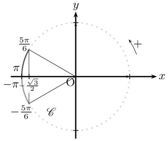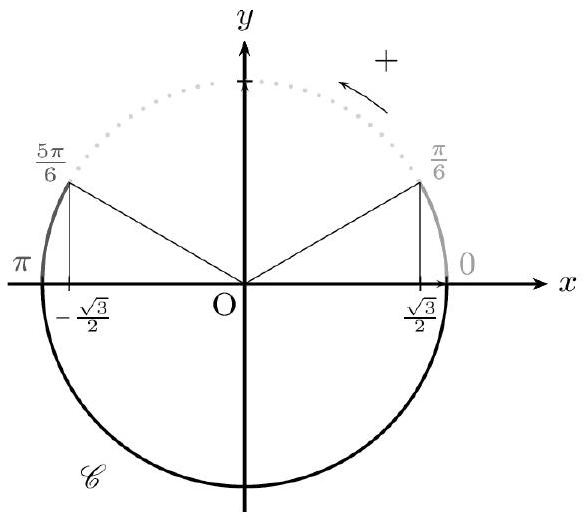 Et comme on raisonne sur $]-\pi ; \pi]$, on obtient : $\quad x=\frac{5 \pi}{6} \quad$ ou $\quad x=-\frac{5 \pi}{6}$.