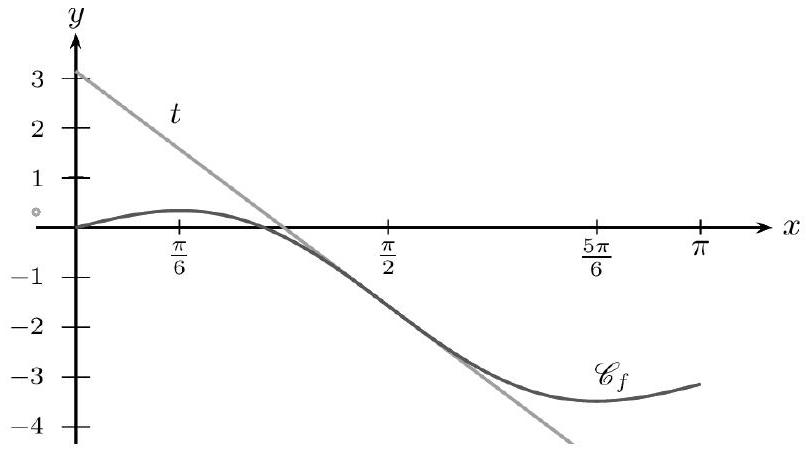 Montrer que $f^{\prime}(x)=4 \cos ^{2} x-3$. 3.a. Résoudre l'inéquation : $4 X^{2}-3 \geq 0$. 3.b. Résoudre sur $[0 ; \pi]$ l'inéquation $4 \cos ^{2} x-3 \geq 0$, puis déterminer le sens de variation de $f$ sur $[0 ; \pi]$. 4. Retrouvons le sens de variation de $f$ sur $[0 ; \pi]$ par une autre méthode (non exigible). Résoudre sur $[0 ; \pi]$ l'inéquation $2 \times \cos (2 x)-1 \geq 0$, puis retrouver le sens de variation de $f$ sur $[0 ; \pi]$. 5. Déterminer une équation de la tangente $t$ à $C_{f}$ en $\frac{\pi}{2}$. 6. Représenter graphiquement $\mathrm{C}_{f}$ et $t$.