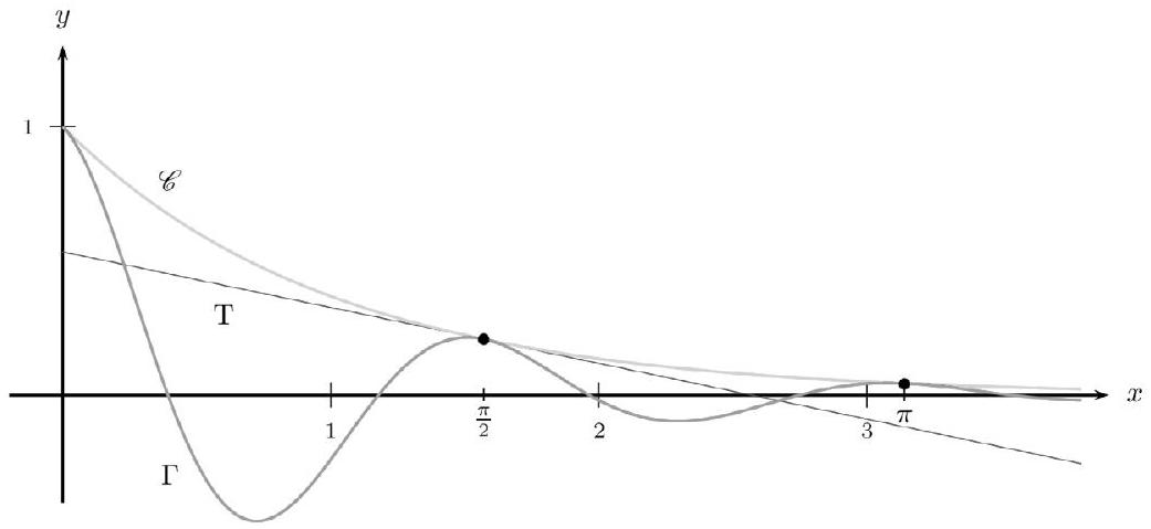 Soit la fonction $f$ définie sur $\left[0 ;+\infty\left[\right.\right.$ par : $f(x)=e^{-x} \cos (4 x)$ et $\Gamma$ sa courbe représentative tracée un repère orthonormé ci-dessous.