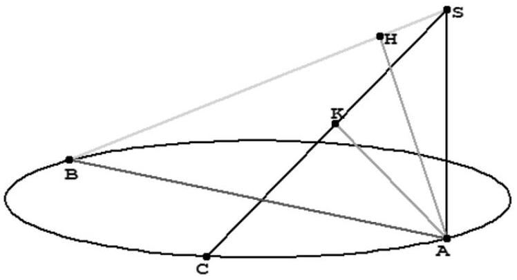 Or $\overrightarrow{C B}$ est normal au plan (ASC) (d'après le 1.). Donc il est orthogonal à tout vecteur appartenant à la direction du plan (ASC), en particulier au vecteur $\overrightarrow{A K}$ (qui appartient évidemment à la direction du plan (ASC). On a donc $: \overrightarrow{A K} \cdot \overrightarrow{C B}=0$ (c). Par ailleurs, comme $K$ est le projeté orthogonal de $A$ sur la droite (SC), on a : $\overrightarrow{A K} \cdot \overrightarrow{C S}=0 \quad$ (d) . Par conséquent, d'après (c) et (d), $\overrightarrow{A K}$ est orthogonal à deux vecteurs directeurs du plan (BSC). Donc $\overrightarrow{A K}$ est normal au plan (BSC). 3. On a : $\overrightarrow{S B} \cdot \overrightarrow{H K}=\overrightarrow{S B} \cdot(\overrightarrow{H A}+\overrightarrow{A K})$ (Chasles).