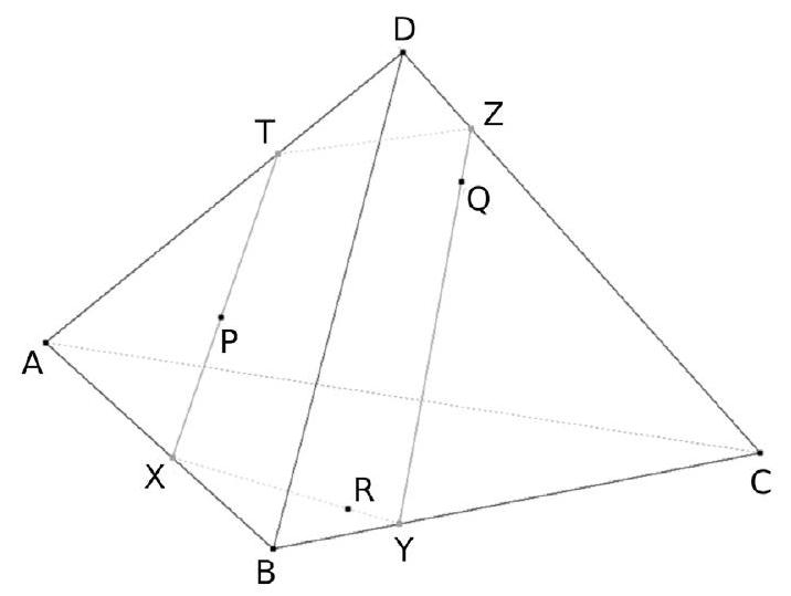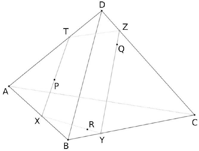 La section du tétraèdre ABCD par le plan $(\mathrm{PQR})$ est le quadrilatère XYZT.