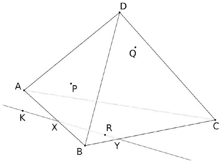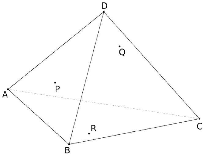 Un décorateur veut tendre une toile plane dans un édifice en forme de tétraèdre. Pour des raisons esthéthiques, il veut absolument que cette toile affleure 3 points P , Q et R qu'il a placés sur certaines faces de l'édifice. Le tétraèdre ABCD est dessiné ci-après. Le point $P$ est sur la face $A B D$. Le point Q est sur la face BCD . Le point R est sur la face ABC .