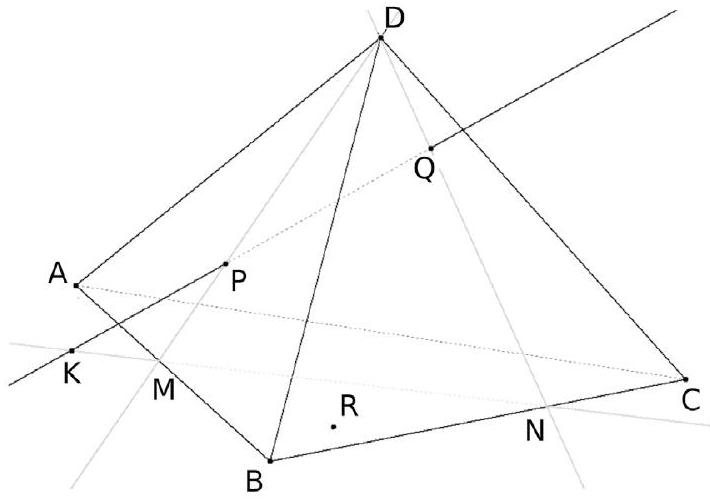 - Comme M est sur la droite ( AB ), il est donc dans le plan ( ABC ). De même, il est clair que N est également dans ( ABC ). Donc la droite ( MN ) est incluse dans ( ABC ). Et comme $K$ est sur $(\mathrm{MN}), \mathrm{K}$ est donc dans le plan ( ABC ). Par ailleurs, comme $K$ est dans $(\mathrm{PQ})$, il est dans le plan (PQR). Donc finalement K appartient à l'intersection des plans ( ABC ) et ( PQR ).