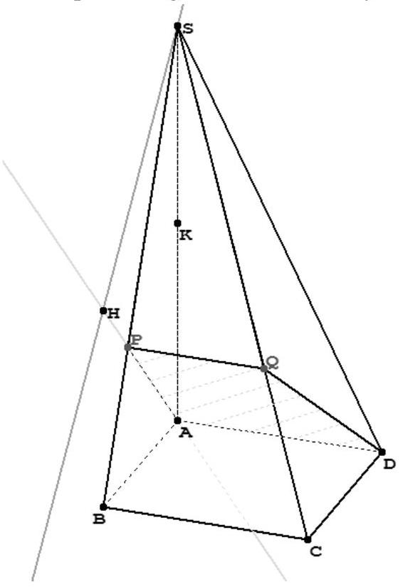 D'où : $t-(2-t)=0$, et par là : $t=1$. Par conséquent : $\left{\begin{array}{l}x=1 \ y=0 \ z=1\end{array}\right.$ Donc $\mathrm{H}(1 ; 0 ; 1)$. 7. Il est clair que la pyramide PQDAS a pour base APQD et pour hauteur HS .
