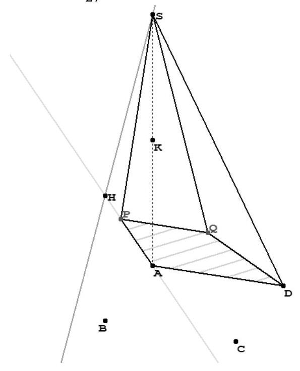 Les coordonnées de Q qui appartient aux 2 droites vérifient les 2 représentations paramétriques : Donc : $\left{\begin{array}{l}\frac{2}{3}=1+t \ t^{\prime}=1+t \ \frac{2}{3}=-2 t\end{array}\right.$ Et par là : $\left{\begin{array}{c}-\frac{1}{3}=t \ t^{\prime}=\frac{2}{3} \ -\frac{1}{3}=t\end{array}\right.$ En reportant $t=-\frac{1}{3}$ dans la représentation paramétrique de (SC), on obtient : $\mathrm{Q}\left(\frac{2}{3} ; \frac{2}{3} ; \frac{2}{3}\right)$. 4. Comme les droites $(\mathrm{AD})$ et $(\mathrm{PQ})$ sont parallèles, les bases du trapèze APQD sont AD et PQ . Montrons que sa hauteur est AP .