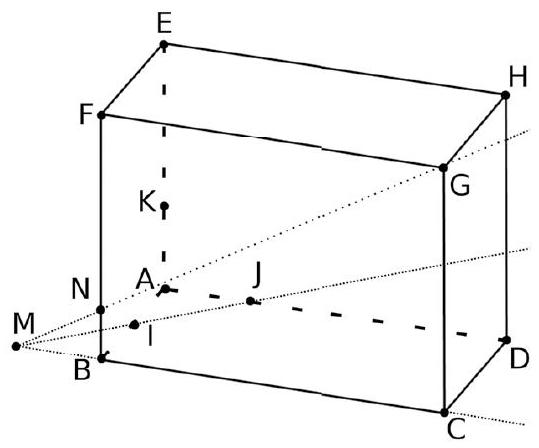 Remarque : nous pouvons calculer rapidement la distance BN en utilisant 2 fois le théorème de Thalès. $\left{\begin{aligned}(A J) / /(B M) & \ I & \in[A B] \ I & \in[J M]\end{aligned} \quad\right.$ donc $: \frac{M B}{J A}=\frac{B I}{A I} \quad$ soit : $\frac{M B}{1}=\frac{1}{1} \quad$ et donc : $M B=1$.