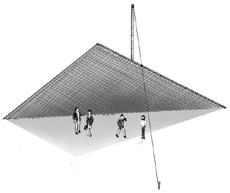 Un mat situé derrière le toit retient ce dernier par l'intermédiaire d'un cable d'acier tendu entre le sommet de ce mat et le sol.