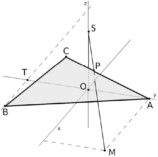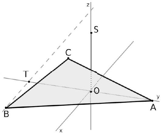 L'axe Oy passe par O et A (évident). L'axe Oz passe par O et S (évident). Pour déterminer l'axe Ox , on place d'abord le point $\mathrm{T}(0 ;-1 ; 0)$. Puis on trace la droite (TB). L'axe Ox passe par O et est parallèle à la droite $(\mathrm{TB})$. Une illusion d'optique laisse croire, à tort, que ces droites ne sont pas parallèles sur le dessin.