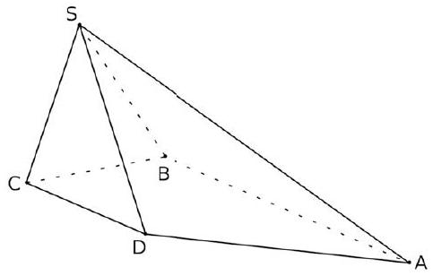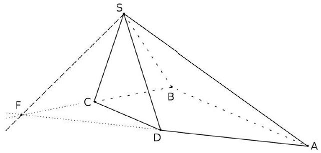 ABCDS est une pyramide non aplatie telle que, d'une part : les droites $(\mathrm{AB})$ et $(\mathrm{CD})$ sont parallèles, d'autre part: les droites $(\mathrm{CB})$ et $(\mathrm{DA})$ ne sont pas parallèles.