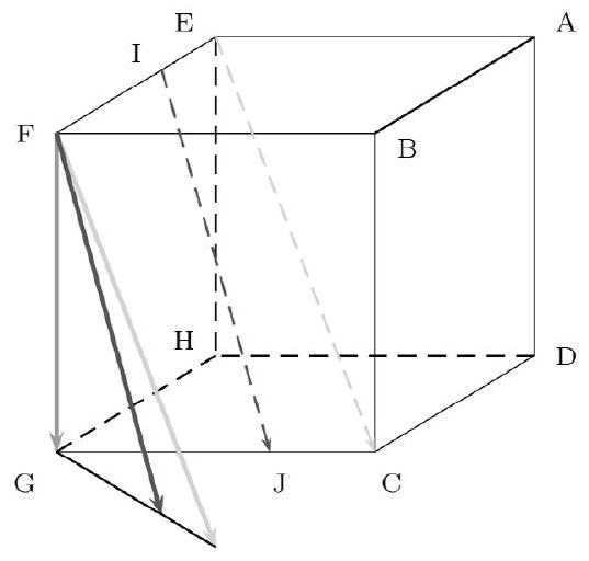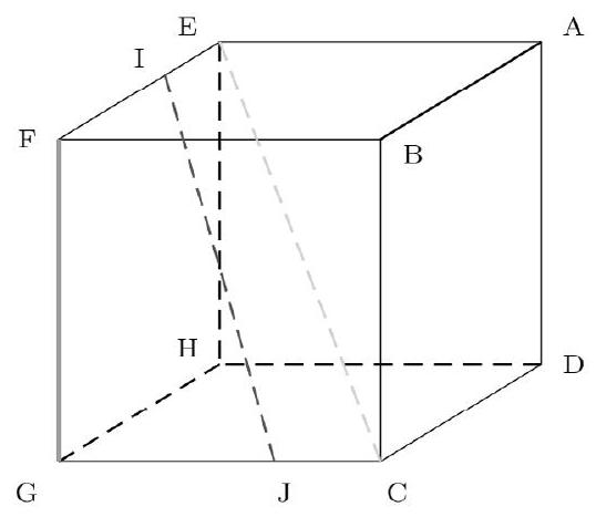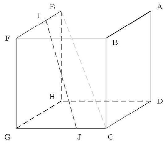 - Montrer que les points $\mathrm{F}, \mathrm{G}, \mathrm{I}, \mathrm{J}, \mathrm{E}$ et C ne sont pas coplanaires.