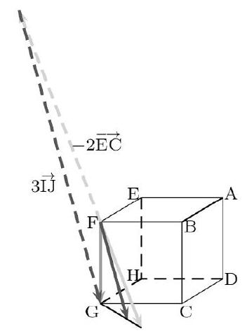 Soit : $\overrightarrow{E C}=-\overrightarrow{G H}-\overrightarrow{G F}+\overrightarrow{G C} \quad$ (d'après (1)). 3.b. On a : $\overrightarrow{I J}=\overrightarrow{I F}+\overrightarrow{F G}+\overrightarrow{G J} \quad$ (Chasles).