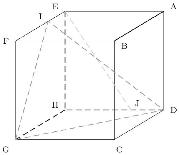 a. Comme ABCDEFGH est un cube de côté non nul, ( $G, \overrightarrow{G C}, \overrightarrow{G H}, \overrightarrow{G F}$ ) constitue un repère de l'espace. Déterminer graphiquement les coordonnées de $\overrightarrow{E J}, \overrightarrow{G D}$ et $\overrightarrow{G I}$ (ne pas justifier). b. Déterminer par le calcul deux nombres réels $x$ et $y$ tels que $\overrightarrow{E J}=x \overrightarrow{G D}+y \overrightarrow{G I}$. c. Conclure.